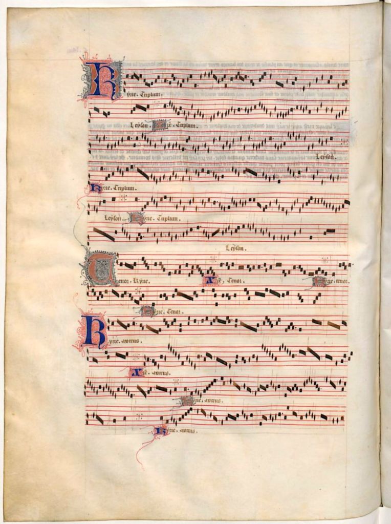 It’s this focus on the horizontal melodic line rather than the vertical ‘chords’ of accompaniment that is a feature of much of the music of this period. Here’s a famous example: the first through-composed setting of the ordinary of the Mass by one of the fourteenth century’s greatest composers and poets, Guillaume de Machaut.