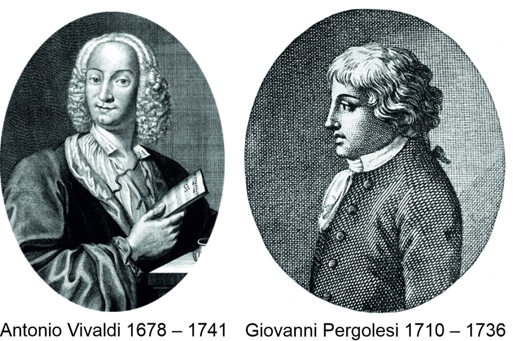 Two of the most famous figures of the Italian Baroque. Pergolesi – as you can see – died tragically young (at 26, of tuberculosis), while Vivaldi had, for the time, a long life but, sadly, ended it in Vienna in a state of poverty.