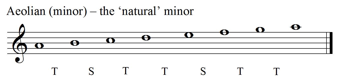 The Aeolian (TSTTSTT) is, like the Ionian, a case of survival under another name. As you know ‘traditional’ music theory allowed for only two (out of the seven possible) modes and named them, not the Ionian and the Aeolian, but the major and the minor. However, in order to fit the Procrustean bed of tonality, certain alterations had to be made to this ‘natural’ minor mode, and there arose the double-headed dragon (tormentor of young instrumentalists) of harmonic and melodic minor scales.