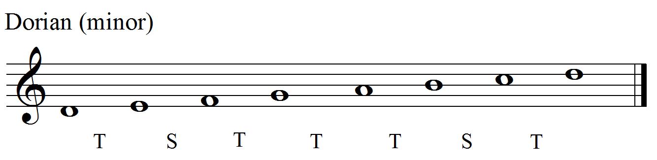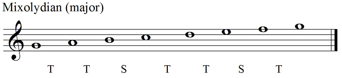 The Mixolydian’s pattern is TTSTTST: almost a major scale (TTSTTTS) but with the last two intervals reversed