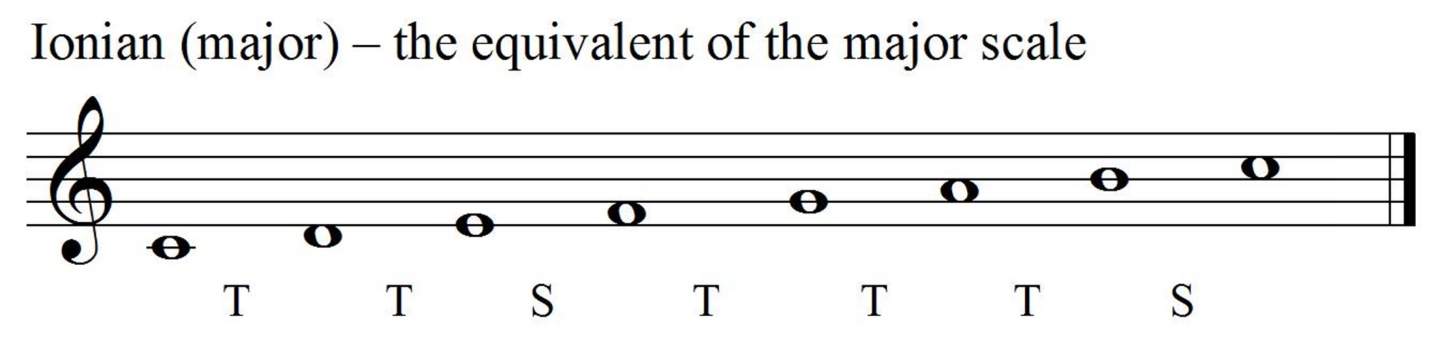 The difference between key and mode? Well, key has to do with pitch (G major has one sharp and starts on G, E-flat major has three flats and starts on E-flat, etc.); but mode is concerned with pattern. You’ll notice that under each of the examples of modes below I’ve written their template, expressed in the distance between each consecutive note [S =semitone, the smallest pitch difference in European music and T =tone= 2 semitones)]. The Ionian/major scale’s pattern/template is, therefore TTSTTTS (check it out on the keyboard):