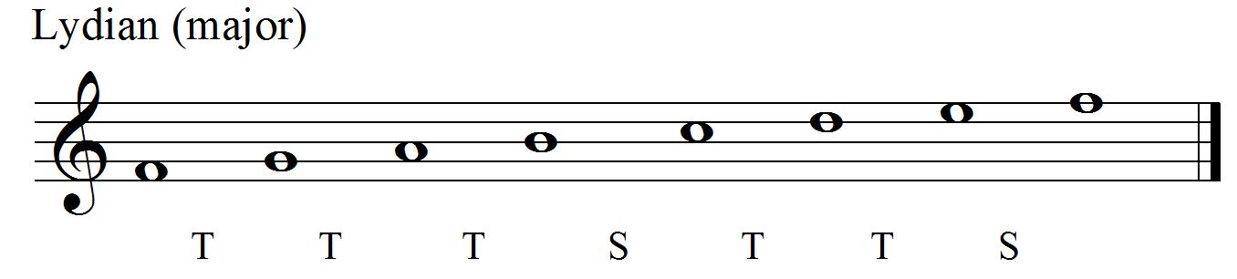 The Lydian mode runs from F to F giving us a TTTSTTS template. It starts off like a major scale but has added bite (rather like being surprised by a tangy cheese or a squirt of lemon juice) in its sharpened fourth note (B-natural – the scale of F major has a B-flat).