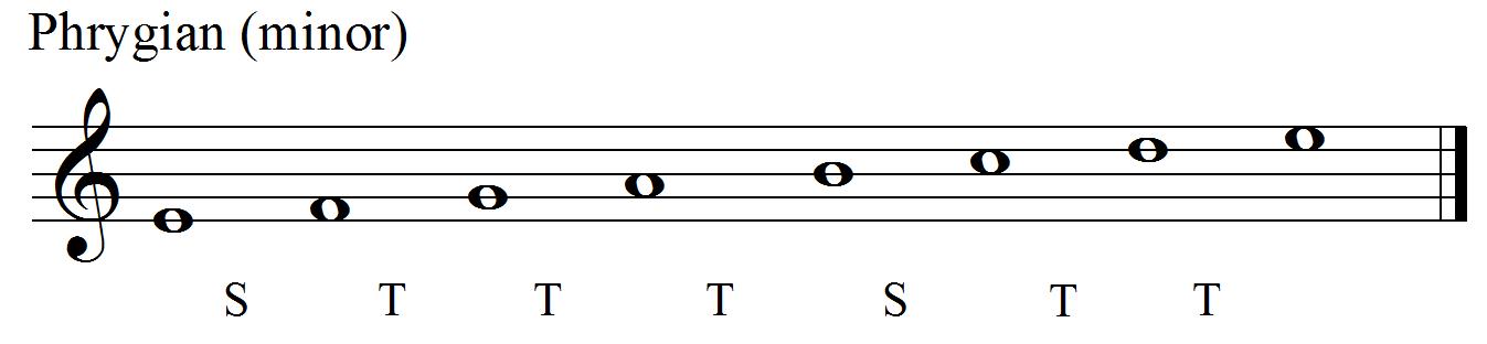Next up is the scale from E to E (you’re either getting the hang of this by now or have fallen asleep); it produces the pattern STTTSTT and is called the Phrygian mode.