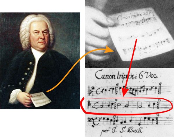 In the header image of this blog (‘signed’ portraits of Bach and Wagner) you can see that the older composer is holding a piece of paper, unsurprisingly this turns out to be manuscript paper; even closer inspection (see below) reveals that it contains the music of the six part triple canon BWV1076.