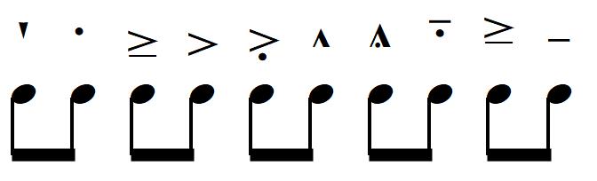One of a conductor’s jobs – other than deciding the tempo of the music – is to choose how individual notes are to be articulated (should they sound for all or just a part of the time allocated to the note? how are they to be attacked?) Below you can see a (far from comprehensive) selection of articulation marks, ranging, from on the far left, staccatissimo (extremely short) through to tenuto (sustained) on the far right.