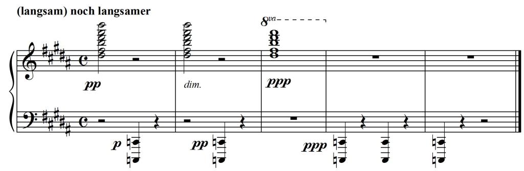The final bars (in short score) of Strauss’s Also Sprach Zarathustra; notice the key signature 5 sharps – B major. Now, while the top, treble clef, end of the orchestra is dutifully reiterating a few quiet chords in the home key (a respectable, if rather downmarket, way to end a piece), you’ll notice that, at the bass clef end of things, the cellos and basses are subverting the whole calm ending thing by insisting on a note (C-natural) that just simply doesn’t belong; and, to make matters worse, they get the final word.