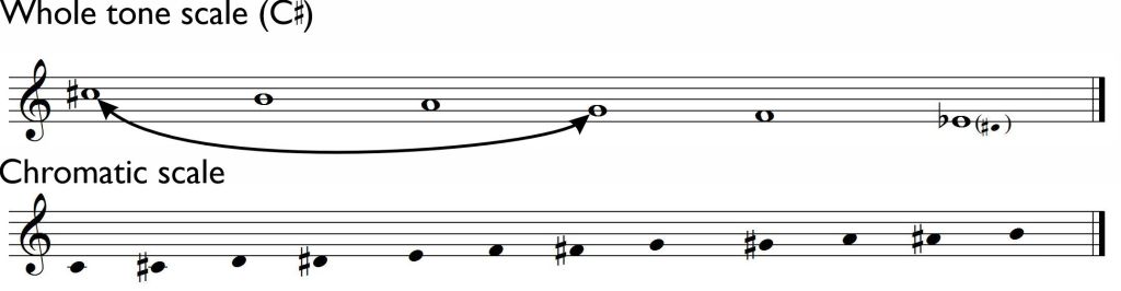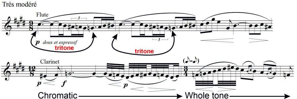 … and its melodic outlines with their tonally ambiguous use of tritones, chromaticism and the whole tone scale: