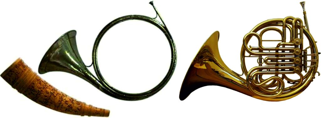 As you can see, the horn started out life as, literally, an animal horn, then developed into the ‘natural’ (no valves or pistons) instrument, eventually ending up as the rather complicated piece of machinery you see on the right.