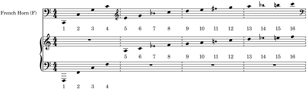 All three versions of the instrument – as are all the orchestral brass – are based on the same acoustic phenomenon – the overtone series. Every sounded pitch is coloured by a series of ‘ghost’ notes that give its timbral quality, its individual instrumental sound. These ghost notes are known as harmonics, overtones or partials. By changing lip shape and breath quality a horn player can move through these partials up as far as – and sometimes beyond – the sixteenth. Here, as an example, are the basic available pitches on the natural horn in F: