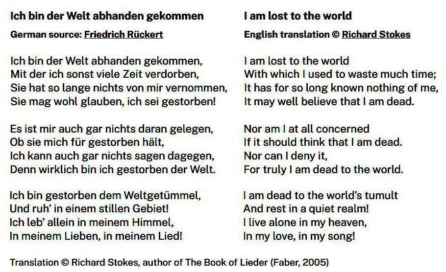 Of all of Mahler’s several settings of the poetry of Friedrich Rückert, one of the most famous is Ich bin der Welt abhanden gekommen [I am lost to the world]. Here’s the text, which is divided into four line stanzas: