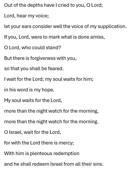 Among her last works is this choral/orchestral setting of Psalm 130 – De Profundis (Out of the depths have I cried to you, O Lord).