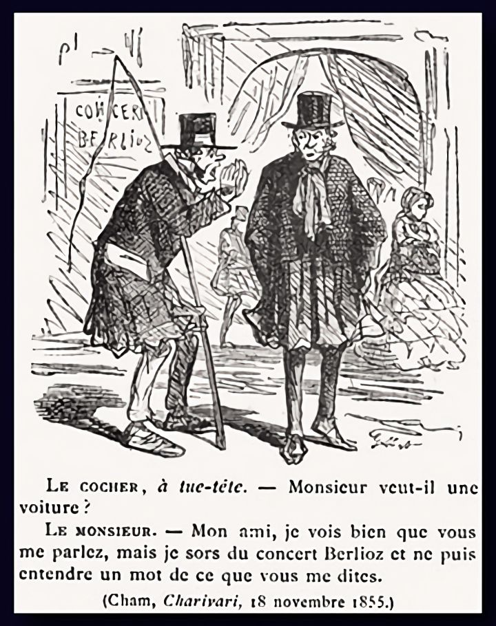 The gentleman: My friend, I can see that you’re talking to me, but I’ve just come out of a Berlioz concert and can’t hear a word you’re saying.